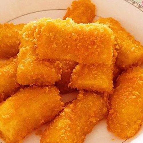 - Heat cooking oil in a fryer or deep pan, then add the breaded banana pieces. Fry for approximately 5 minutes until the exterior turns golden brown and crispy.