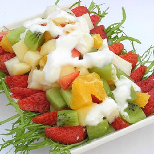 - Place the bitter melon at the bottom of the plate, place all the diced fruits on top, then pour in an appropriate amount of yogurt and it is ready to serve.