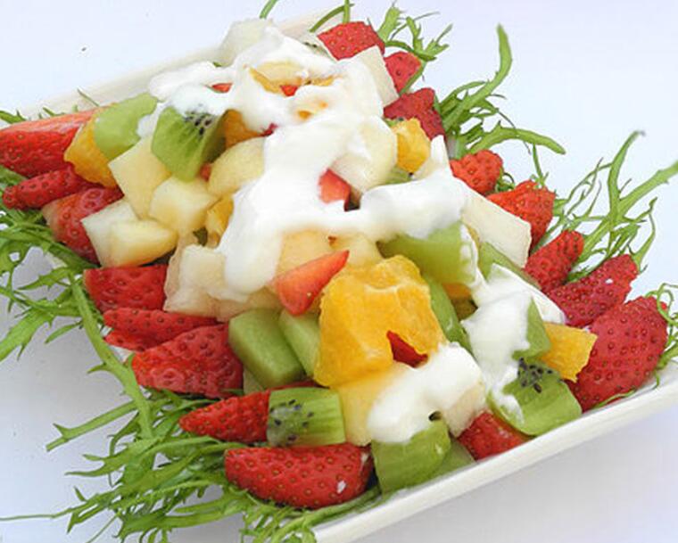 - Place the bitter melon at the bottom of the plate, place all the diced fruits on top, then pour in an appropriate amount of yogurt and it is ready to serve.