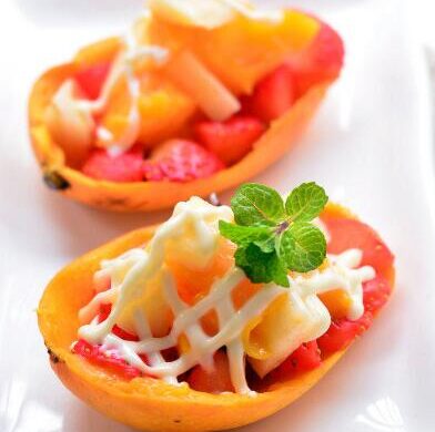 - Mix the above fruits together, pour into the mango shell, and coat with salad dressing