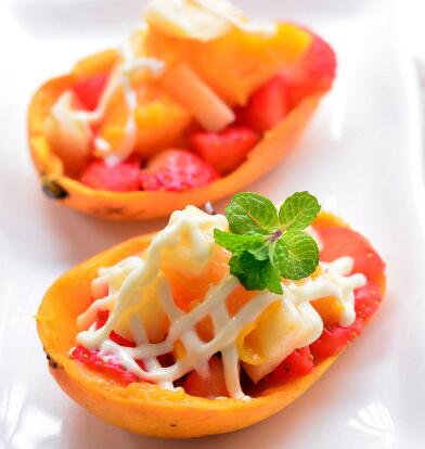 - Mix the above fruits together, pour into the mango shell, and coat with salad dressing